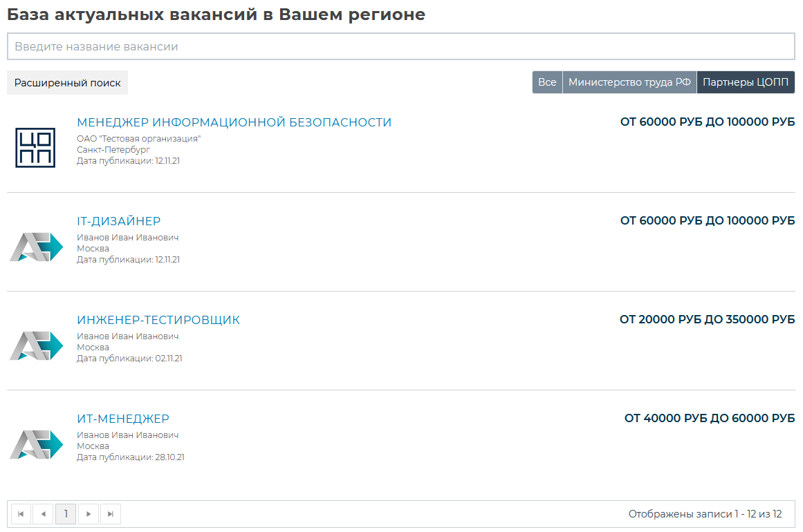 В базе представлены вакансии, размещенные партнерами ЦОПП, а также вакансии c ресурса Trudvsem.ru от Министерства труда РФ.