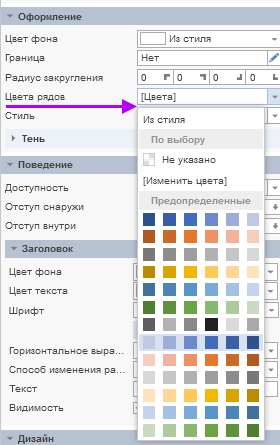 Наборы цветов для создания оттенков зависят от значения свойства Цвета рядов, и могут быть выбраны из стиля элемента или из предустановленных коллекций цветов в списке.
