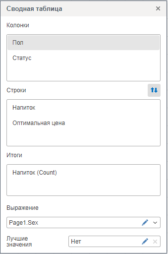 В Cводную таблицу необходимо добавить как минимум одно поле данных в графу Итоги. Настройки элемента Сводная таблица размещаются в редакторе элемента.