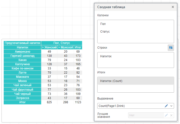 На пересечении колонок и строк сводной таблицы формируются ячейки, называемые итогами. В эти ячейки добавляются значения из соответствующей ячейки источника данных. Затем, все значения каждой строки и каждого столбца будут просуммированы и отображены в результирующих ячейках отображаемой сводной таблицы. В поле Итоги можно указать несколько полей данных. В этом случае, в сводной таблицы будут добавлены ячейки как для первого поля данных, так и для второго.