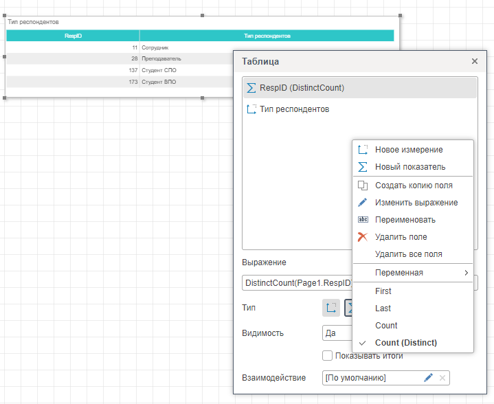 Изменение типа графы данных осуществляется в редакторе элемента Таблица, при помощи кнопок Показатель и Измерение.
