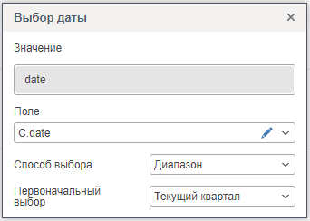 В редакторе элемента Выбор даты осуществляется добавление элементов с данными, настройка режима выбора значений, выбирается главный элемент фильтрации.