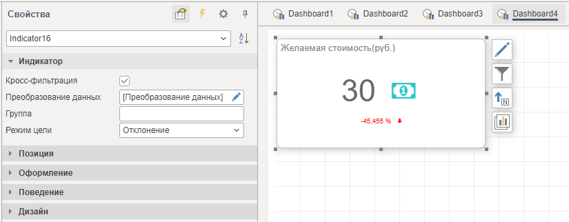 На панели свойств с помощью свойства Режим цели можно выбрать режим расчета целевого показателя индикатора: Отклонение или Доля.