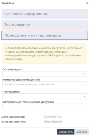 Для прикрепления мат-тех ресурсов необходимо нажать на вкладку «Помещение и мат-тех ресурсы» и редактировать поля:
