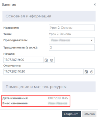 Редактирование дополнительной информации по выбранному занятию