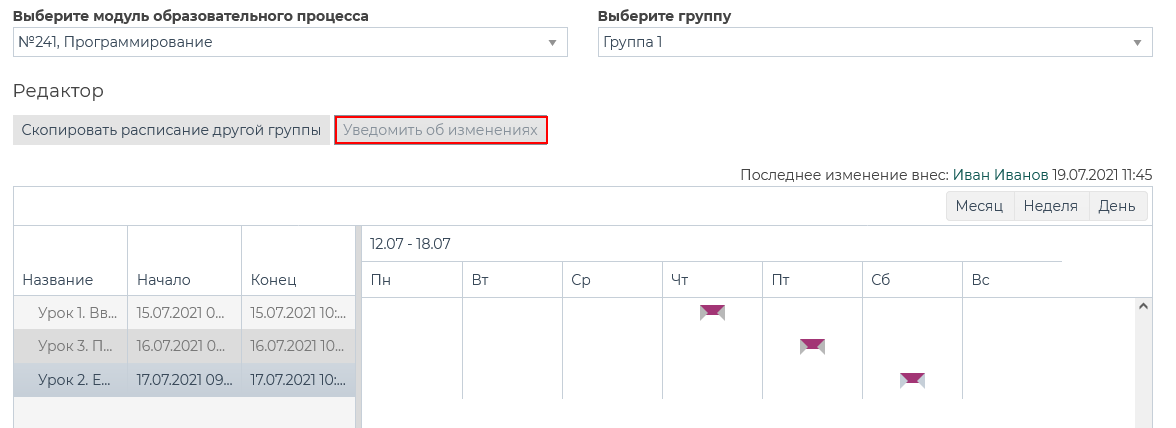 Для того чтобы уведомить обучающихся об изменениях в расписании необходимо нажать кнопку