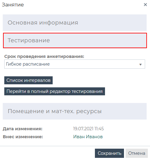 Для того, чтобы время тестирования совпадало со временем занятия, необходимо нажать кнопку [Добавить интервал по времени занятия].