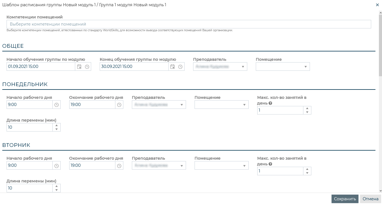 Шаблон расписания формируется автоматически после создания новой группы обучающихся.
