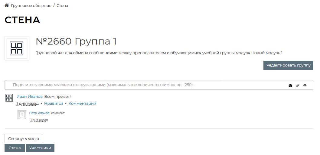Для того, чтобы скрыть кнопки [Стена] и [Участники], необходимо нажать на кнопку