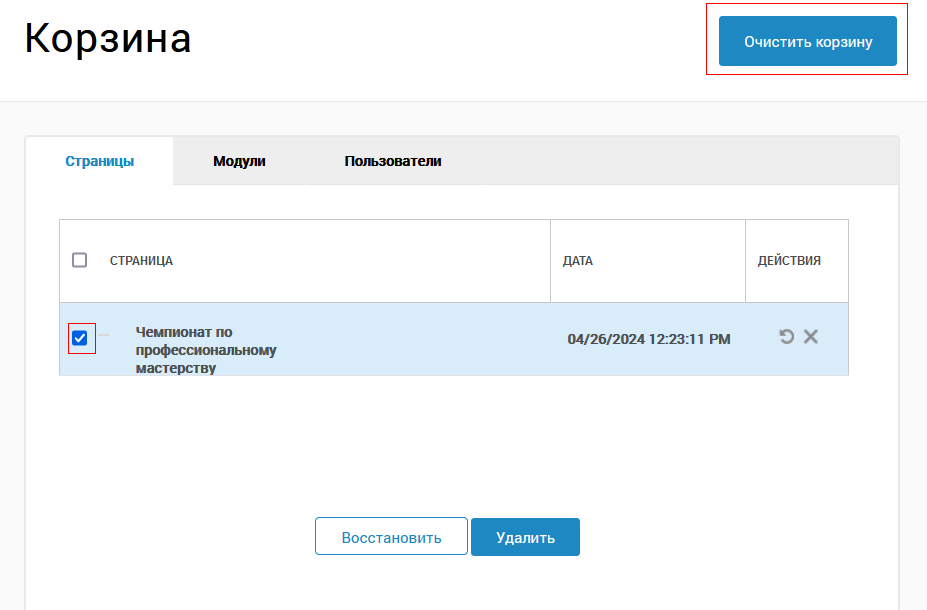 Страницы и модули удаляются с сайта не окончательно, а переносятся в так называемую «Корзину».