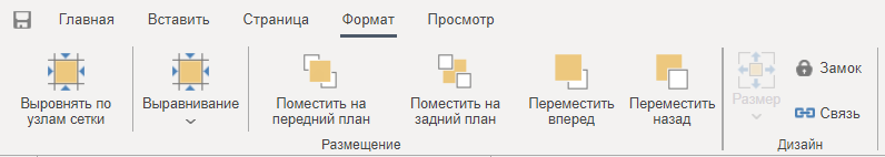 Вкладка Формат - это вкладка панели дизайнера отчетов, на которой расположены команды управления размещением компонентов на странице и элементов на панели индикаторов.