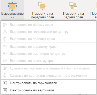 Выравнивание - элемент управления, который предоставляет возможность выровнять выделенные компоненты и элементы указанными способом. При нажатии, будет отображено выпадающее меню со списком команд выравнивания. Ниже представлено описание команд выравнивания.