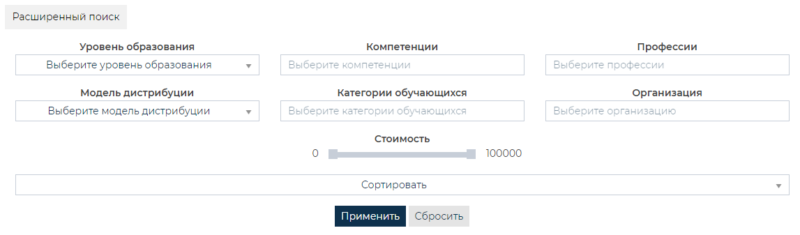 В расширенном поиске есть возможность поиска по уровню образования, компетенциям, профессиям, Модели дистрибуции, категории обучающихся, организациям и стоимости, а также сортировать по критериям в выпадающем списке.