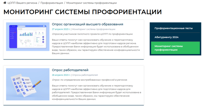 На странице Мониторинг системы профориентации может быть размещен перечень дополнительных опросов граждан, работодателей, образовательных и муниципальных организаций в сфере мониторинга ЦОПП профориентации региона или отрасли.