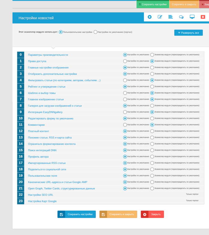Для настройки модуля необходимо нажать ссылку Настройки в меню над списком новостей. В каждом пункте есть подпункты для более детальной настройки модуля. Чтобы развернуть пункты можно кликать на каждый по отдельности или нажать кнопку «Развернуть все», чтобы развернуть все сразу.