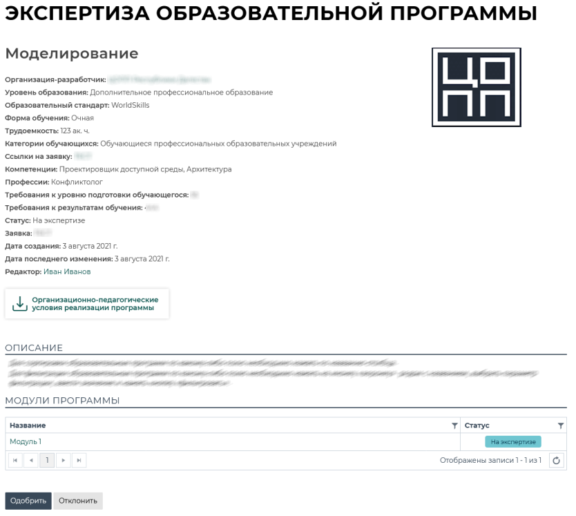 Для того чтобы одобрить или отклонить образовательную программу, необходимо нажать на кнопку [Карточка]