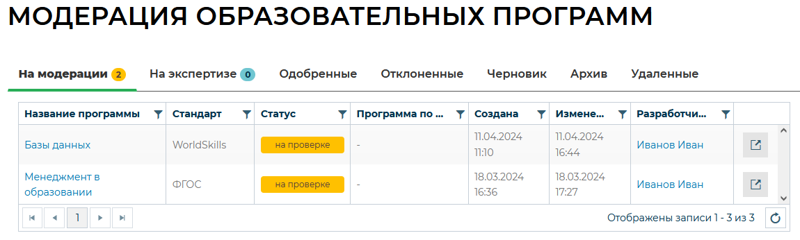 На данной странице отображаются программы, ожидающие проверки модератором, а также все программы всех сотрудников-разработчиков организаций. Программы разбиты по вкладкам: