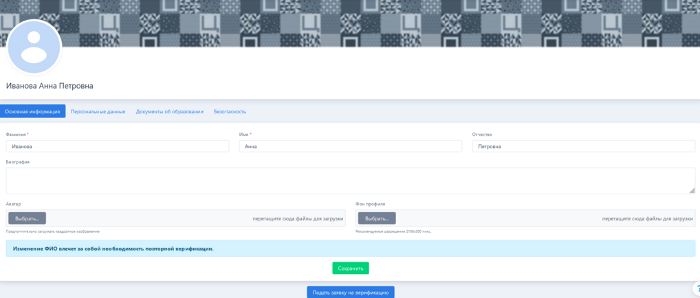 Для полноценного использования сервисов Платформы, необходимо заполнить свой профиль пользователя достоверными данными и пройти процедуру верификации пользователя Модератором ЦОПП.