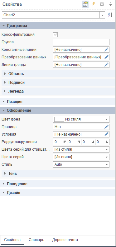 На панели Свойства отображаются свойства выделенного компонента Аналитического отчета или элемента Панели индикаторов.