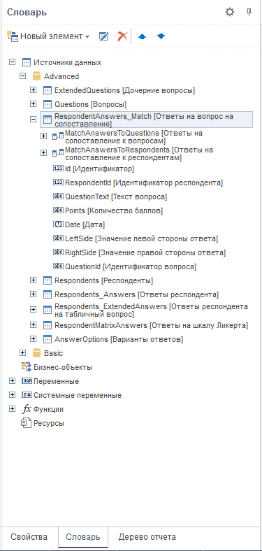 Словарь данных - панель, на которой отображаются все созданные источники данных, переменные, функции, ресурсы.