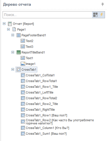 Дерево отчета - панель, на которой отображается иерархия компонентов отчета или элементов панели индикаторов.