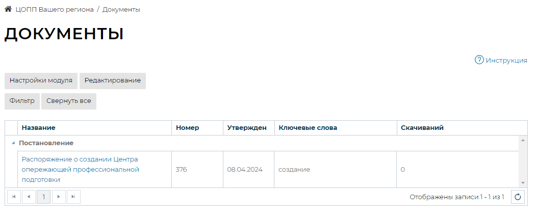 , расположенную над таблицей. Станет доступен модуль документов в режиме редактирования.