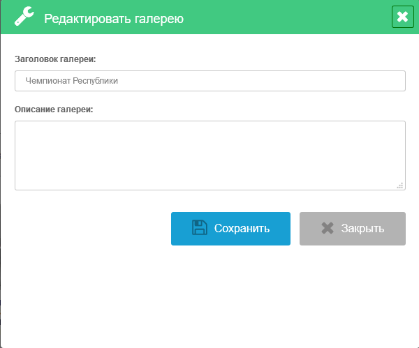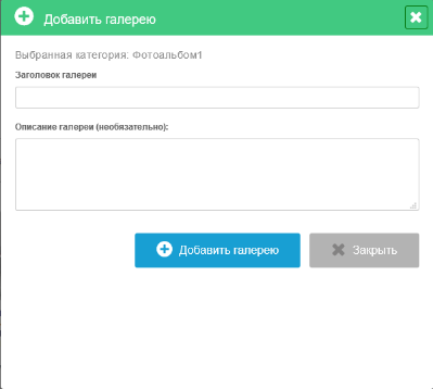 Для создания нового фотоальбома необходимо нажать кнопку «Добавить галерею», расположенную под заголовком модуля. Во всплывающей форме необходимо ввести название альбома, его описание и нажать кнопку «Добавить галерею».