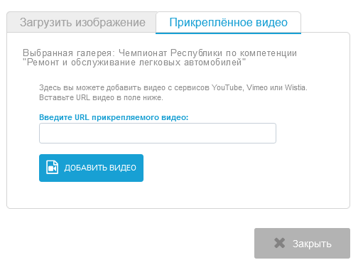 Для видео необходимо выбрать с какого ресурса добавляется видео и указать URL, заполнить прочие поля настроек, нажать кнопку «Добавить».
