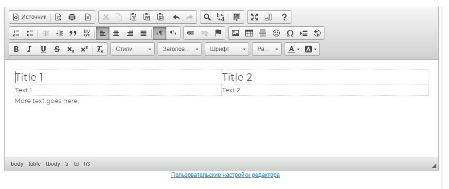 Для добавления таблицы нужно выбрать в самом модуле HTML пункт создание таблицы и задать необходимый размер (например, 3х2), а затем добавлять информацию в ячейки созданной таблицы.