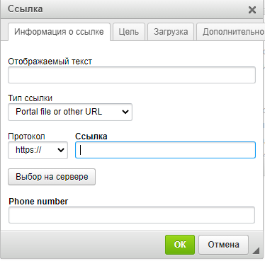 В появившемся окне на вкладке Информация о ссылке выбрать в тип ссылки, протокол, и указать ссылку на сторонний сайт или страницу Платформы в поле Ссылка.