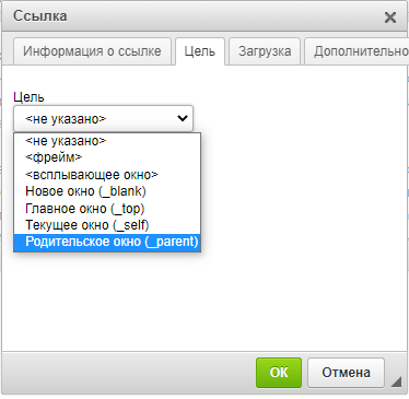 Также на вкладке «Цель» можно указать в поле «Цель», т.е. выбрать в каком окне будет открываться Ваша ссылка.