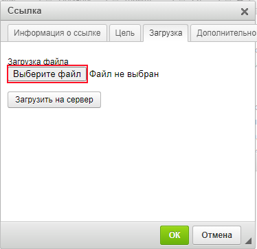 Если необходимо загрузить документ как ссылку, то на вкладке Загрузка нажать кнопку Выберите файл, выбрать нужный файл, нажать кнопку «Загрузить на сервер». Откроется уже заполненная вкладка Информация о ссылке.