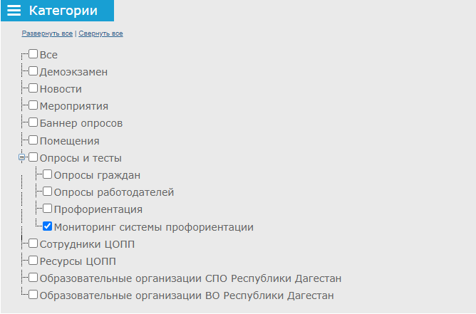 В разделе «Категории» выберите одну из следующих категорий: «Опросы граждан», «Опросы работодателей», «Мониторинг системы профориентации».