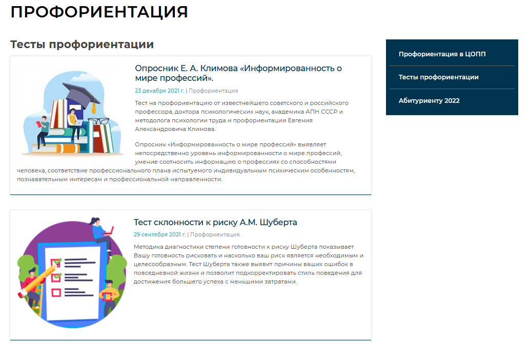 Для того, чтобы ссылка на прохождение тестирования была доступна пользователям в разделе Профориентационные тесты, Модератору необходимо предварительно добавить её на платформу в виде статьи.