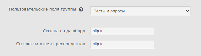 Для отображения ссылки на дашборд и ответы респондентов теста для пользователя с ролью Координатор необходимо заполнить пользовательские поля. В поле «Пользовательские поля группы:» выберите значение «Тесты и опросы». В поле «Ссылка на дашборд» укажите ссылку на дашборд теста, в поле «Ссылка на ответы респондентов» укажите ссылку на ответы респондентов.