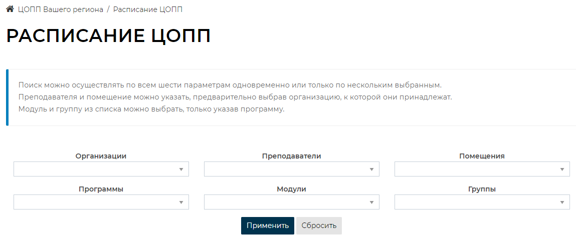 В модуле доступен фильтр по параметрам: Организации, преподаватели и помещения; Программы, модули и группы.