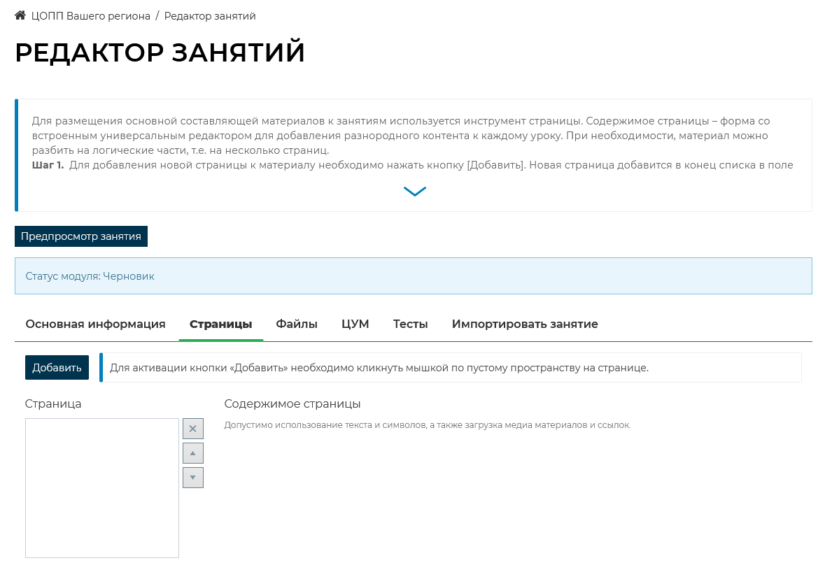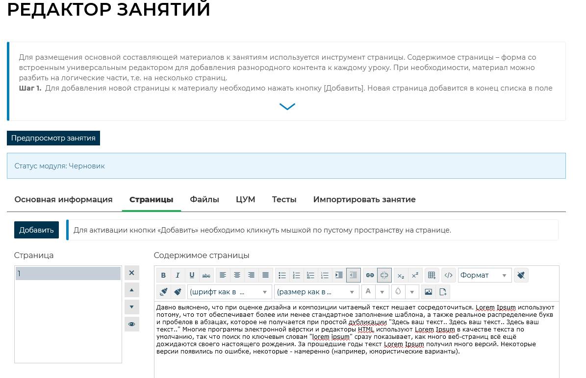 Редактор занятий. Вкладка «Страницы»