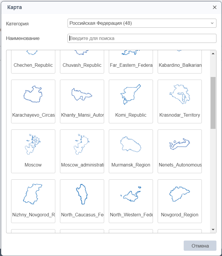 При добавлении Региональной карты на панель индикаторов открывается окно Карта в котором можно изменить вид региональной карты. Все карты сгруппированы по региональным категория. В зависимости от выбранной категории, в списке будут отображаться карты определенного вида. В поле Наименование можно указать имя карты для поиска карты определенного вида.