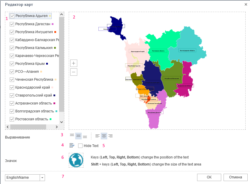 Настройка элемента осуществляется в его редакторе. Для открытия редактора, необходимо выбрать элемент Региональная карта, и в контекстном меню выбрать команду Изменить
