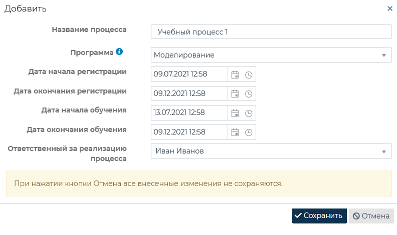 Менеджер образовательных процессов. Кнопка «Добавить»