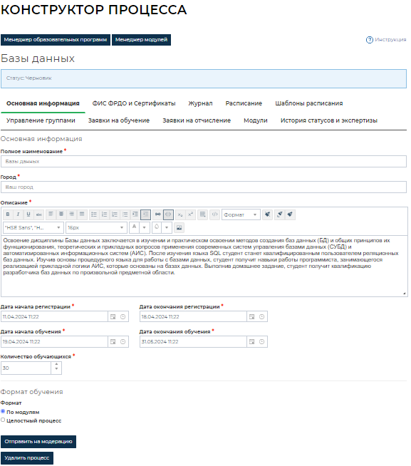 Создание образовательного процесса. Вкладка «Основная информация» конструктора процесса.