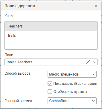 В поле Ключ указывается элемент данных, значения которого будут формировать иерархию и отображаться в элементе Поле с деревом.