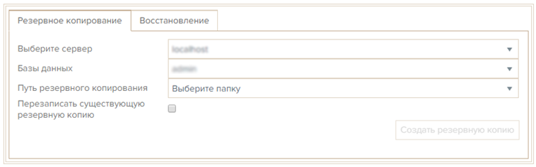Для создания резервной копии данных Платформы необходимо выбрать сервер, на котором хранятся данные, копируемую базу данных и путь резервного копирования, а также при необходимости поставить галочку «Перезаписать существующую резервную копию». После того как всё выбрано, нажать кнопку «Создать резервную копию».
