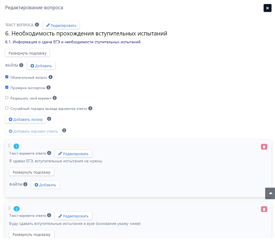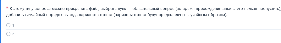 К этому типу вопроса можно прикрепить файл, выбрать пункт – обязательный вопрос (во время прохождения анкеты его нельзя пропустить), разрешить добавлять свой вариант ответа (отвечая на вопрос, пользователь сможет предложить свой вариант ответа), добавить случайный порядок вывода вариантов ответа (варианты ответа будут представлены случайным образом).
