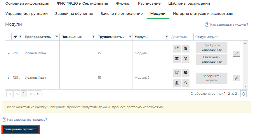 Если есть модули, на которых нет никаких заявок или нет ни одной необработанной заявки и нет активных студентов в группе, то ответственный может завершить процесс без подачи преподавателем заявки на завершение модуля. У преподавателя также имеется возможность завершить свой модуль, который удовлетворяет перечисленным выше условиям.