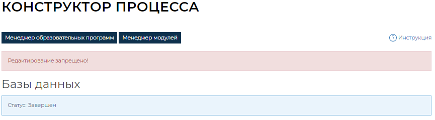 Для завершения процесса нужно выбрать в разделе меню личного кабинета Конструктор образовательных программ, нажать Менеджер образовательных процессов и перейти на вкладку «Активные», нажать на кнопку меню