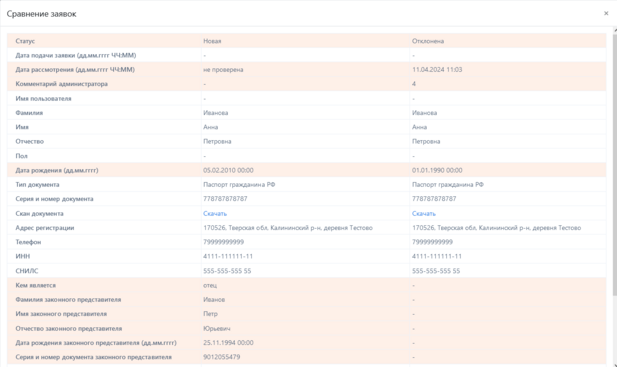 Сравнивать заявки можно только в том случае, когда пользователь подавал заявку на верификацию более одного раза.